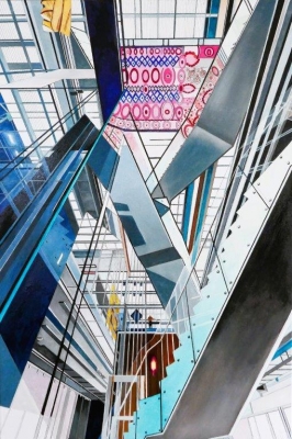 This central hall was a wonderful source of inspiration for Herberts painting. With the interplay of lines, use of color and incidence of light he wants to continue to hold the viewer in this labyrinth.