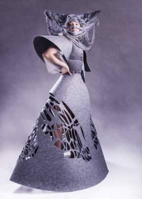 It is a unique composition that looks like a sculpture, which looks great as an exhibition standing on a mannequin or on a person. The project was made of unconventional materials such as technical felt, secondary threads, silver bumps, as well as light interior fabrics. Everything was made by hand and from recycled materials. The techniques used are cutting, dyeing, leathercraft art.