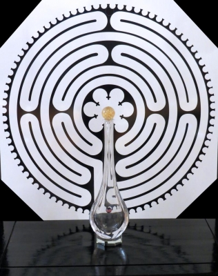 Nello specifico, la scultura in vetro - ideata da Simone Origio e realizzata in collaborazione con Renata Ferrari - è una rielaborazione moderna di fiola (bottiglia soffiata dal ventre arrotondato e dal collo allungato tipica della produzione muranese tradizionale). È composta da due elementi: l’ampolla, con la sua forma rotonda e racchiusa, richiama il femminile, l’inconscio e l’utero; il tappo, che penetra nell’ampolla, richiama il maschile, la coscienza e il fallo. Come il maschile feconda il femminile, così lo sguardo cosciente feconda l’inconscio e lo porta alla luce: guardarsi dentro è un atto generativo.