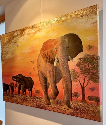 Elephants are in many cultures a symbol of wisdom, loyalty and strength. They often remind us of serenity, a much desired state these days of being peaceful and untroubled. This painting is painted in oils with gold foil and it‘s special texture is gained by added pebbles.