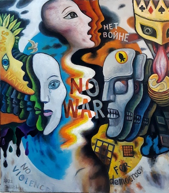 I, an artist from Kazakhstan, have been drawing since childhood. At 78, I have seen a lot in my life. I tried to be a free artist in thinking about the meaning of life and the images of my time. In the picture, I simply and frankly express real events on our planet, inhuman cruelty. The aggression of one side on the territory of the other, the death of civilians. The destruction of freedom of speech and democracy, the tightening of the dictatorship, the deterioration of the Earth's ecology. The meaning of the picture is this: "People, think again! Take a broader look at the madness that is going on around!"