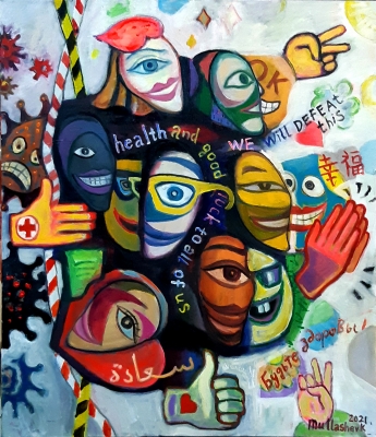 This painting, the right part of the triptych "The World Tragedy of Covid-19", expresses the confidence of mankind to win and protect itself from the epidemic. It is written with shades of the humorous language of painting, so I express my desire of the artist from Kazakhstan: health to all the peoples of the globe in different languages.