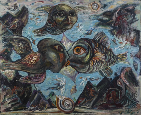 This picture was painted by me in 1990 for one customer, for a sauna, on the theme "love". Seeing the finished painting, he refused to buy. This did not upset me, because love happens not only among people, but also among many living beings on earth, sometimes even sincere and pure.