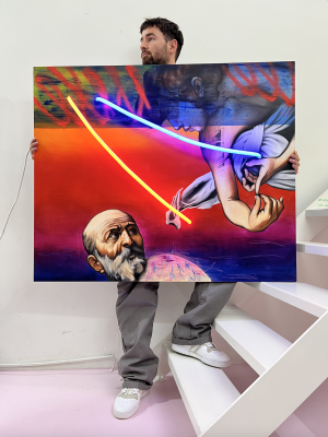 I want to maintain the quality of the old masterpieces, like the Saint Matthew and the Angel, while adding subtle and effective contemporary details, with gradient colors and  neons. A kind of Clair Obscur reinterpreted. Nevertheless, this reinterpretation of Carravaggio leaves room for a disconcerting luminosity, it thus enlightens the person who observes it. All in balance between classic and street art.