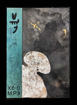 L'artista partendo da una riflessione sul significato dell'antica icona votiva, luogo di mediazione tra immaneneza e trascendenza, ne propone provocatoriamente una trasposizione contemporanea.Tracce d'oro simboleggiano come nell'antichità sacralità e luce divina, ma anche cupidigia e venalità. Su un fondo sgretolato campeggia una stringa alfanumerica, sorta di password che gestisce il nostro quotidiano. Sarà l'occasione di un ennesimo selfie o la sollecitazione per un attimo di raccoglimento?