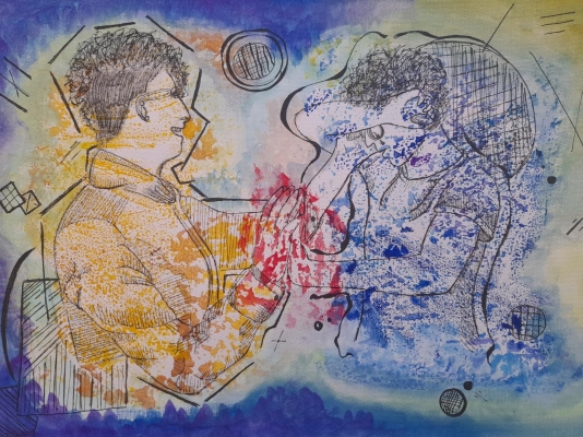 rivisitazione personale dell'opera " GIALLO , ROSSO , BLU "  di kandisky. Propio come lui esprime in quest'opera il giallo e il blu esprimono rispettivamente la felicità e le paura dell'artiste, nel caso descritto le felicità sono date dalla presenza di una persona cara e le paure dal terrore di perdere la lanterna che illumina ogni giorno le proprie giornate oppressa da pensieri sempre piu pesanti.
