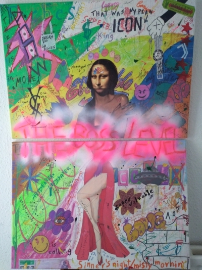 This painting is about two canvas becoming one. Only together they make sense. It is "mixed media", the center of the upper canvas is a printdesign of a modern Mona Lisa, surrounded by several, small modern interpreted draws and paintings, painted with acrylcolors and crayons. Topped with many, for my artworks typical, motivational and positive quotes. The bottom canvas presents the legs of the legendary comic character Jessica Rabbit, painted with acrylcolors, also surrounded by small draws and paintings and my typical positive quotes. To create a transition between the two canvases and to clarify the concept of the painting, i sprayed a big graffiti writing between the canvases. In the background white color, topped with pink color to create some kind of neon effect.