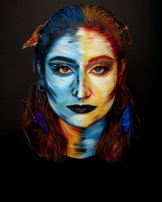 My face art shows the context between darkness and wonderland. Every situation in life has a dark and bright side. This shows my face with the blue and yellow side. The most important thing is that both sides are poised. The butterflies symbolize the development of yourself. My portrait calls "Wonderland After Darkness" because the bright, yellow side is coming and the Wonderland of your life can start.