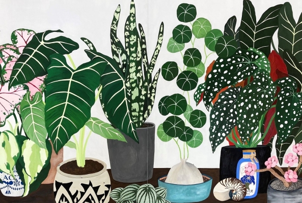 By watering them, placing them by the sun and even just looking at them in quiet contemplation, we are consoled, comforted and filled with positive emotions and feelings. I wanted to share my acknowledgement of the quiet power of the plants thorough this painting. I described the shapes and colours of the natural beauty in dark and solid lines, and use colours to represent the energy and liveliness that brings small hope and expectation that is needed to get through difficult times.
