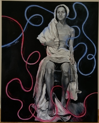 The picture is painted with acrylic technique. It shows a girl in black and white colors as a reflection of an ancient painting. In the background, neon lines are placed to symbolize contemporary painting. The girl as an early painting without which this image would not exist, as well as the old painting without which contemporary artists would not be able to draw so much inspiration. Neons interpenetrate to form one whole. Colors fall on the figure, giving it hues. It symbolizes hopes for a change of form and a better future.