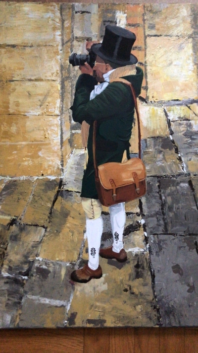 un uomo vestito con abiti stile impero intento ha fotografare con una macchina reflex qualcosa che oltre il nostro sgurado, ma cio che ci attira è proprio questa differenza di epoche che non capiamo se ci troviamo nel presente o nel passato poiche neanche un elemento ci aiuta a capirlo lo sfondo non è ben definito. quindi possiamo immaginarlo come una persona che vive tra le due epoche