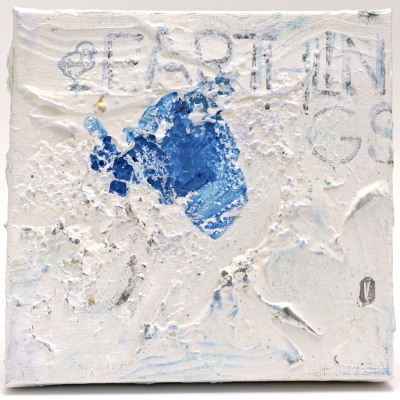 The artwork shows the lake of melted water in the centre of a snow-covered landscape with the shape of a chick and the word “earthlings”.