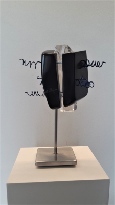 Scultura in marmo nero del Belgio e Plaxiglass assemblati con incisioni da cui dipartono elementi metallici colorati