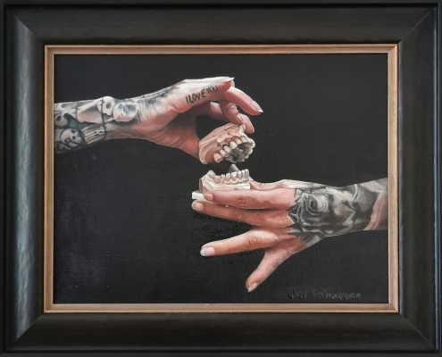 „Talking Hands“ The central representation of the painting by Kurt Stimmeder, entitled "Talking Hands", is a denture held by two tattooed hands. Depicted on a black background, the image plays with the title of the picture, in an allegorical way with the colloquial expression for gesticulating. But it is also a game with aesthetics and taboo. Teeth, always an expression of vitality and in recent decades subject to a strong ideal of beauty, enjoy a very special attention. In their central function in speech and nutrition, they accompany us throughout life and are perhaps thereby the most immediate indication that tells of the decay of the human body. This unpleasant memory, which we usually prefer to hide, must be faced by the observer in this picture. Our teeth, "I love you" (them)