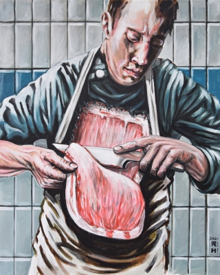 A man cuts a slice out of his chest with great concentration. Clothing and background indicate a slaughterhouse, a place where meat is professionally cut up. Of course, the action in the picture (if only for anatomical reasons) is not possible, it becomes a symbol of the destruction of one's own livelihood. Though cutting out of his own body seems utterly pointless, even cruel, the man continues his cut seemingly painlessly, as if he weren't really involved himself, as if he were performing a normal job that he needs to finish.