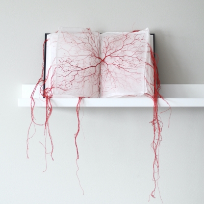 The number of threads increases as I stitch, forming structures that resemble tree veins, root systems, or blood vessels. Those shapes have something in common. They all split into thinner appendages either to absorb or distribute nutrition. The similarity between nature and human body fascinates me. I wonder if this is how the distribution of love would look like; pathways and strings of connection, where something flows from you to another person.