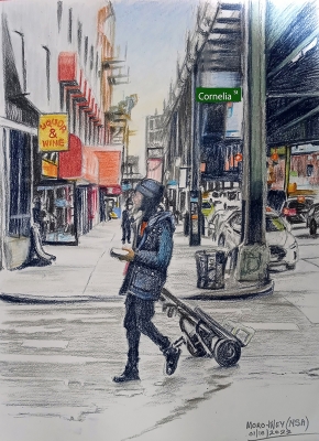 I was fascinated by the delivery man’s gayness and dedication toward his work. The receding overhead subway railroad also captured my attention. I love exploring soft pastel to express my feelings about happenings at different locations in the city.