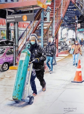 This was a frozen moment around the subway station, when I was attracted to the long green gas cylinder and the pusher along with others wearing masks. The elevated overhead subway station also tempted me with its complicated structural construction which I rendered meticulously in soft pastel. For me, soft pastel is a friendly medium that allows me to tell my stories in full.