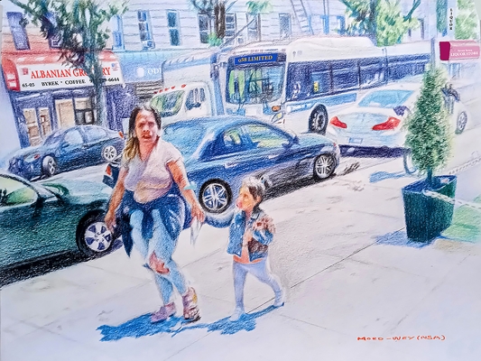 I keep on looking for interesting moments to capture and freeze in the city. This painting is focused on people’s emotions. Love and dependency are shown between the mother and the daughter through their facial expressions and the physical hand fusion. I loved the fact that they needed each other.