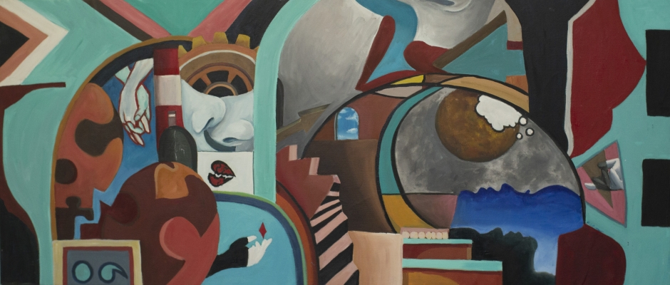 Mercury Retrograde takes on a sexy journey of painting the range of emotions I feel during this astrologic conquest. The puzzle mottifs continue, while color, abstracted composition, and relationship based concepts play throughout the painting.
