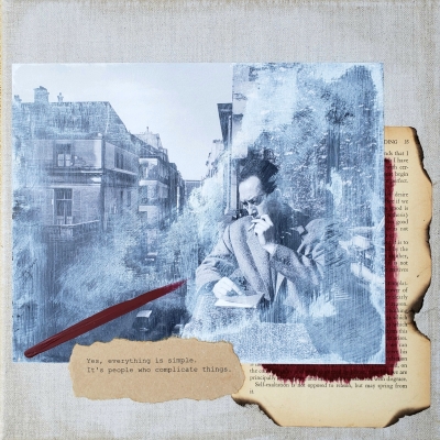 The text on each piece is a quote from the writings of the Philosopher in the photo. I’ve painted over each photo, and then scratched off the paint, leaving only remnants. I’ve used another vintage philosophy book for the pages on each of these works, burning the edges – a nod to all of the smoking that’s going on - and obscuring most of the text with a thin layer of paint so the words hazily rise to the surface.  Some words remain uncovered and loosely allude to the context and quotes.