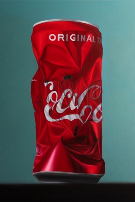 I painted this can, for a series of paintings that I am making of wrappers, packages, containers of commonly used products or fashion accessories. All items related to popular brands that are mass-produced and identical to each other. Only the use for which they are produced makes them unique, as for this crushed can of Coca Cola.