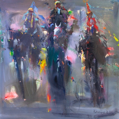 In the work "Meeting" I wanted to show a tradition that shows the relationship between a woman and a man. In the Kazakh tradition, men in ancient times attracted the attention of women by playing the dombra and singing. Dombra is a national instrument of the Kazakh people. In my works I try to fill in the forgotten Kazakh traditions, which for centuries laid the foundation of education and morality. Indeed, in this work you can see red spots, these are the clothes of a girl, traditionally unmarried girls wore red. Also, there are moments where the newlyweds can be accompanied by an older sister on the girl's side. Such traditions are not practiced today, but it shows the depth and uniqueness of the nation.