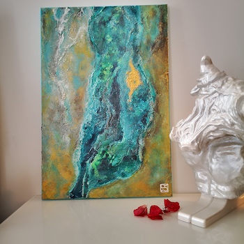Il titolo del quadro (Crisalide di fiume) incarna il carattere surreale del significato che vuole evocare la forza della metamorfosi nello scorrere del tempo. Tempo, gesto e materia sono la stessa cosa.