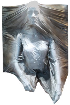 assemblaggio multimaterico: base in forex su cui applicato tramite collante e  fissato con fascette plastiche alla base forata, polistirolo opportunamente sagomato e sopra un busto di manichino plastico tagliato sulla schiena; applicato poi un lenzuolo per coprire il tutto e graffettato sul retro, quindi alcune mani di colla vinilica seguite da alcune di gesso da tela, il tutto rifinito con acrilici spray e verniciato con flatting in gel. misure 80x80 di lato (installata a muro il lato lungo risulta di cm.110) - installazione a muro da cui sporge di circa 35 cm. - anno 2021 -