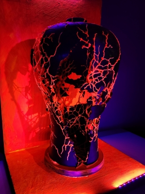 The broken-vase-shaped sculpture and fluorescent crack patterns all over it stand for that simple message. Sometimes we think what we have for granted and permanent or take things too seriously like those negative thoughts are going to last forever. And do more absurd behaviors because we sometimes forget everything’s mortality. We act more blindly to it, the unchangeable fatality of the world shines brighter like fluorescent PLA filaments under ultraviolet lights.