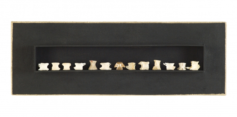 Vertebre di Xiphias Gladius, legno, pigmento oro,sabbia. Anno 2021. Cm. 35 x28