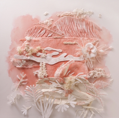 Sculptured from Hahnemuhle (Germany) 300gsm cotton NOT, Arches (France) 310gsm cotton hot-pressed mould made papers and a variety of handmade Hemp, Flax and Kozo (Mulberry) papers from Awagami (Japan) and other Asian sources, some as light as 4gsm. Single colour ink wash background.