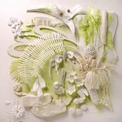 Sculptured from Hahnemuhle (Germany) 300gsm cotton NOT, Arches (France) 310gsm cotton hot-pressed mould made papers and a variety of handmade Hemp, Flax and Kozo (Mulberry) papers from Awagami (Japan) and other Asian sources, some as light as 4gsm. Single colour Ink wash background and scribbly gum bark.