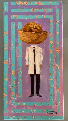 The main subject of the painting is a walnut head man wearing scientist clothes.