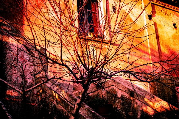 La foto è stata scattata in un vecchio casolare di campagna. Presa d'ispirazione dai rami spogli di questo albero, ho scattato una foto che cercasse di raccoglierli tutti. Poi in postproduzione ho voluto ridargli vita con il rosso, il giallo, il viola... riaccendendolo di fuoco. Ho voluto creare un astratto che simboleggiasse la forza di vivere, partendo da un albero abbandonato in mezzo ad un cortile con i rami spogli.
