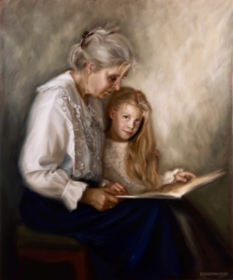 My vision for this painting was to show the closeness between a grandmother (Aukje) and her grandchild (Fem) I wanted to paint them from life, using natural light and a limited pallet. To prepare for such a painting, I always do a lot of research, from the old masters of the 17th century to the portraits of John Singer Sargent. I enjoy this part of the project, getting filled with inspiration but at the same time learning that such a simple idea needs a really good composition. I designed the canvas so that Aukje would create a frame around the child. This also made the lighting so beautiful. The grandmother was backlit, so she would cast a shadow on the child. They both hold the book which becomes a bridge between the two different generations..