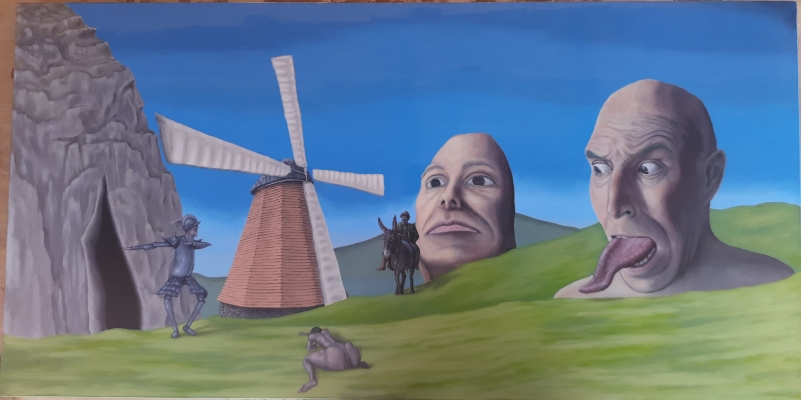Rappresentazione dell'apice di jno stato emotivo che ho affrontato recentemente, tra angoscia frustrazione e parlisi. Ispirato da Bosh, Dalì e Breugel partendo da destra ho rappresentato me terrorizzato, una specie di dolmen umano pietrificato passivo e nell altra metà un don quichotte che cerca scampo da un nemico immaginatii in un rifugio che è un illusione una rappresentazione