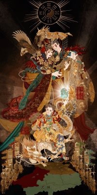是我自己演绎的三国时期的故事,将人物(上方分别是曹操和夏侯惇)的故事以个人的视角展现在同一张画里。相比于其他历史上的众多英雄人物,曹操的个人特色(从诡谲的手腕和充满智力感不走寻常路的手段来说)让我觉得他更合适被演绎成女性,袖子上的花纹是三场重大的战役,濮阳之战,站宛城和官渡之战。旁边夏侯惇的服饰上是农耕图,纪念他开创了耕战一体制。最下面的小孩是我自己原创的一个人物,少年英雄,年轻一代的血脉守护大汉的江山。