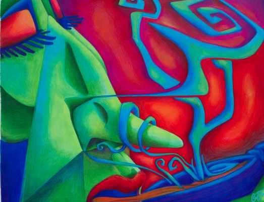 The tantalizing aroma of a fresh coffee takes visual life in this vibrant, mixed media piece.  Originally a scribble exercise, the shapes soon took on the form of tendrils of steam rising above a raised cup of coffee.  Color was blocked out with alcohol markers before being built up with layer upon layer of oil-based colored pencil to create complex and vivid colors.