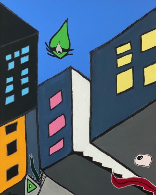 FISH EATING CITY REPRESENTS PLANET EARTH NATURAL WORLD REACTING TO OUR SOCIETY DUE TO CONTAMINATION AND HARM THAT WE PRODUCE TO ALL OUR NATURAL ECOSYSTEMS. ACRYLIC ON CANVAS. PAINTING FRAMED.