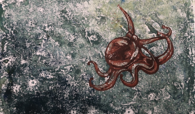 Le seducción de la naturaleza, impresa en técnica mixta de monotipia y xilografía a placa perdida, desde esa oscura profundidad surge la vida en todas sus formas