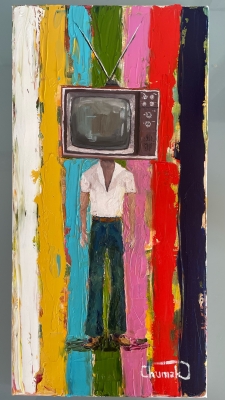 The subject is a man wearing retro clothes having his mind in TV.